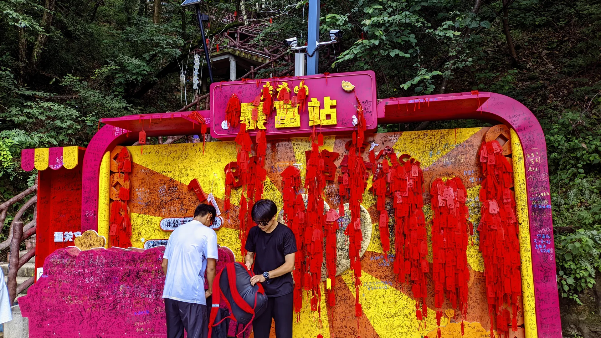 开始爬山,两边的路有护栏,上头写满了,来此地旅游的人的痕迹,都是字,我也写一个